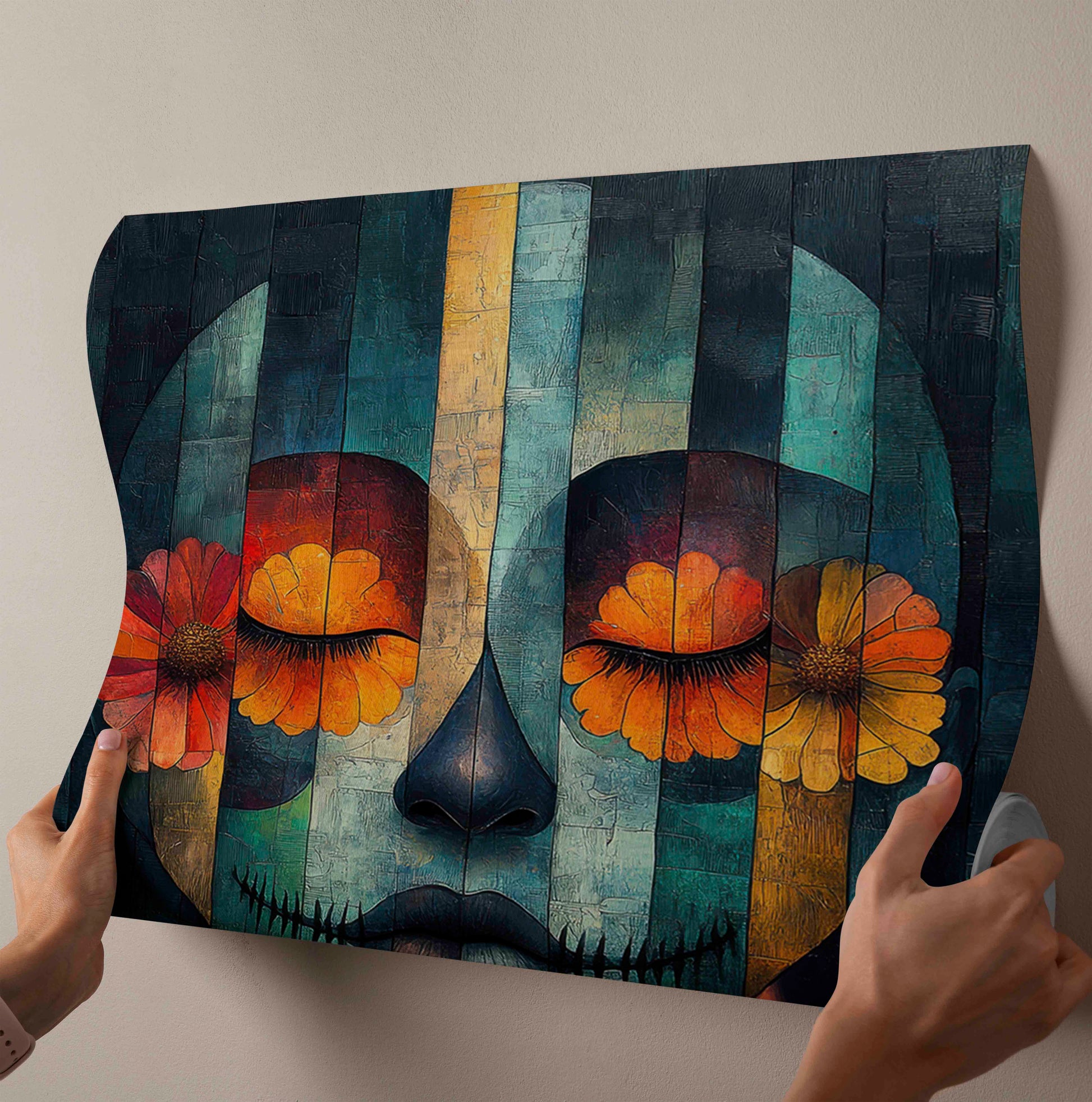 This striking piece offers a modern, textured interpretation of a traditional Calavera (sugar skull), celebrating the imagery of Día de los Muertos (Day of the Dead). The artwork is composed through a unique fractured style, resembling vertical painted wooden slats, which adds immense visual depth and interest.