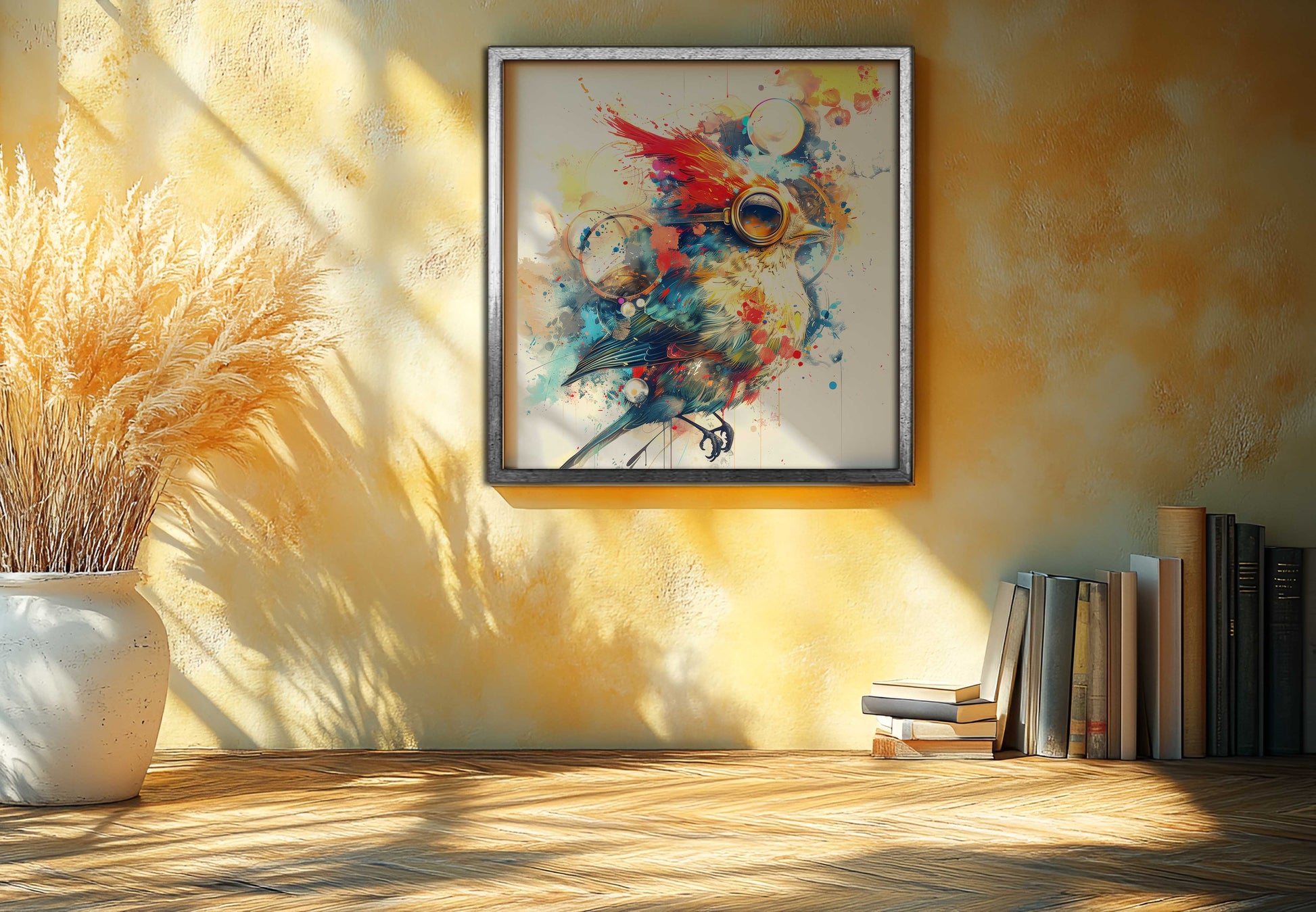 Add a touch of extraordinary whimsy to your space with this captivating canvas print, "Whimsical Steampunk Aviator." This abstract masterpiece features a beautifully rendered bird with vibrant, splatter-style watercolor plumage in red, blue, and yellow, adorned with a unique pair of steampunk goggles. The dynamic, paint-splattered background and metallic lens details create a fusion of art and imagination. Perfect for modern living rooms, offices, or as a unique gift for art and fantasy lovers. Printed on high-quality canvas and ready to hang.
