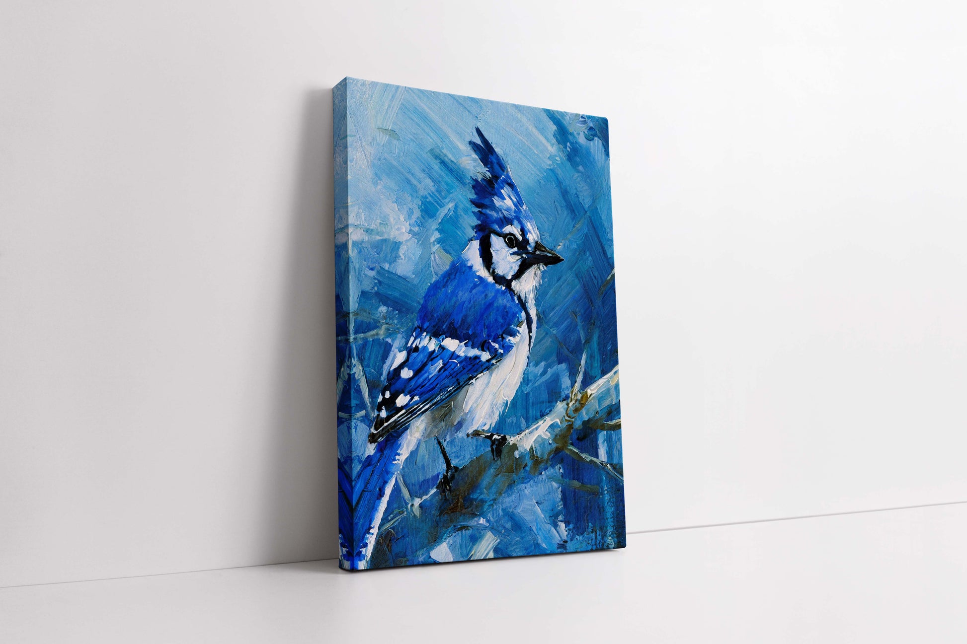 Bring the vibrant spirit of the wild indoors with this stunning impasto canvas painting of a blue jay. Masterfully created with heavy, textured brushstrokes, the artwork captures the bird's brilliant blue, white, and black plumage in dynamic detail. Perched upon a rough branch, the blue jay stands out against a swirling, abstract background of cool blues and whites, evoking a crisp winter's day. The raised texture of the paint adds a unique three-dimensional quality and a sense of movement to the piece, making it a captivating focal point for any room, from a cozy study to a modern living space. Perfect for nature lovers and admirers of expressive art. This is a high-quality canvas print of an original oil painting.