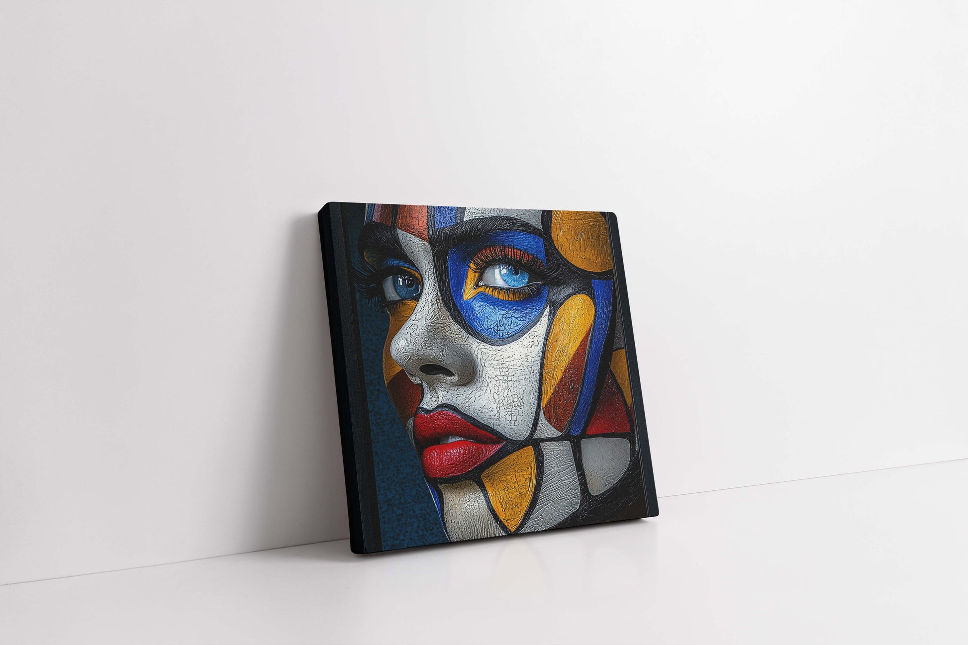 Add a striking modern masterpiece to your collection with this "Fragmented Gaze" canvas painting. This unique artwork features a cubist portrait of a woman's face, rendered in a bold, textured style. Geometric shapes in vibrant blues, reds, yellows, whites, and deep blacks are outlined with thick brushstrokes, creating a visually rich and tactile surface. The piece is further enhanced by a cracked paint effect, adding depth and an antique feel. The subject's piercing blue eyes and red lips provide a powerful focal point. Perfect for the living room, office, or gallery wall, this contemporary art piece is ready to hang and guaranteed to make a statement.
