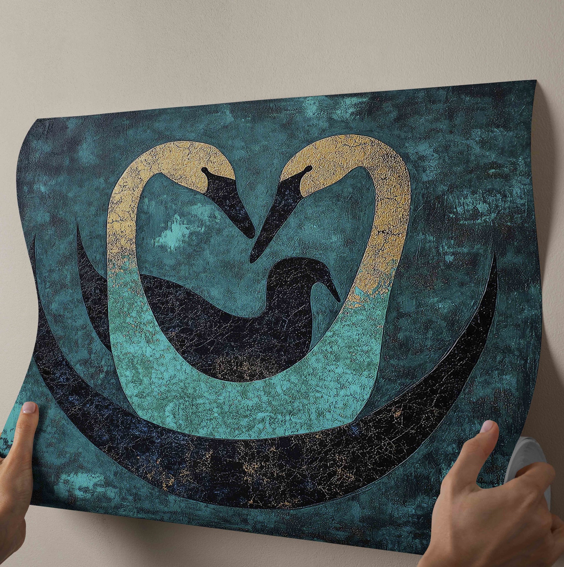 "Gilded Embrace" features two stylized swans whose graceful necks curve to form a perfect heart. Their heads shimmer with textured gold leaf, transitioning into rich turquoise bodies that cradle a smaller, silhouetted bird—a symbol of family, protection, and new life. The trio rests within a dark, crescent-shaped "nest" at the bottom.