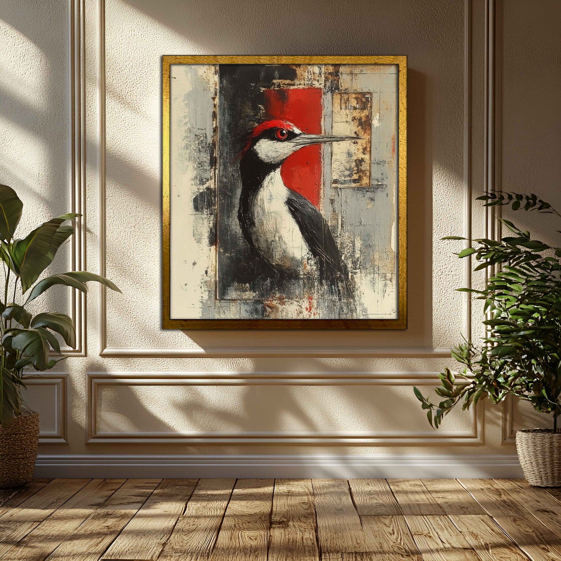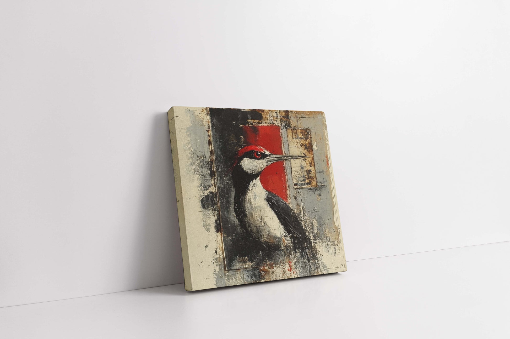 Elevate your space with "Crimson Crest," a striking contemporary portrait that blends the raw beauty of nature with an edgy, industrial aesthetic. This mixed-media style canvas features a meticulously detailed woodpecker set against a backdrop of distressed textures, bold geometric blocks, and a vibrant splash of scarlet.