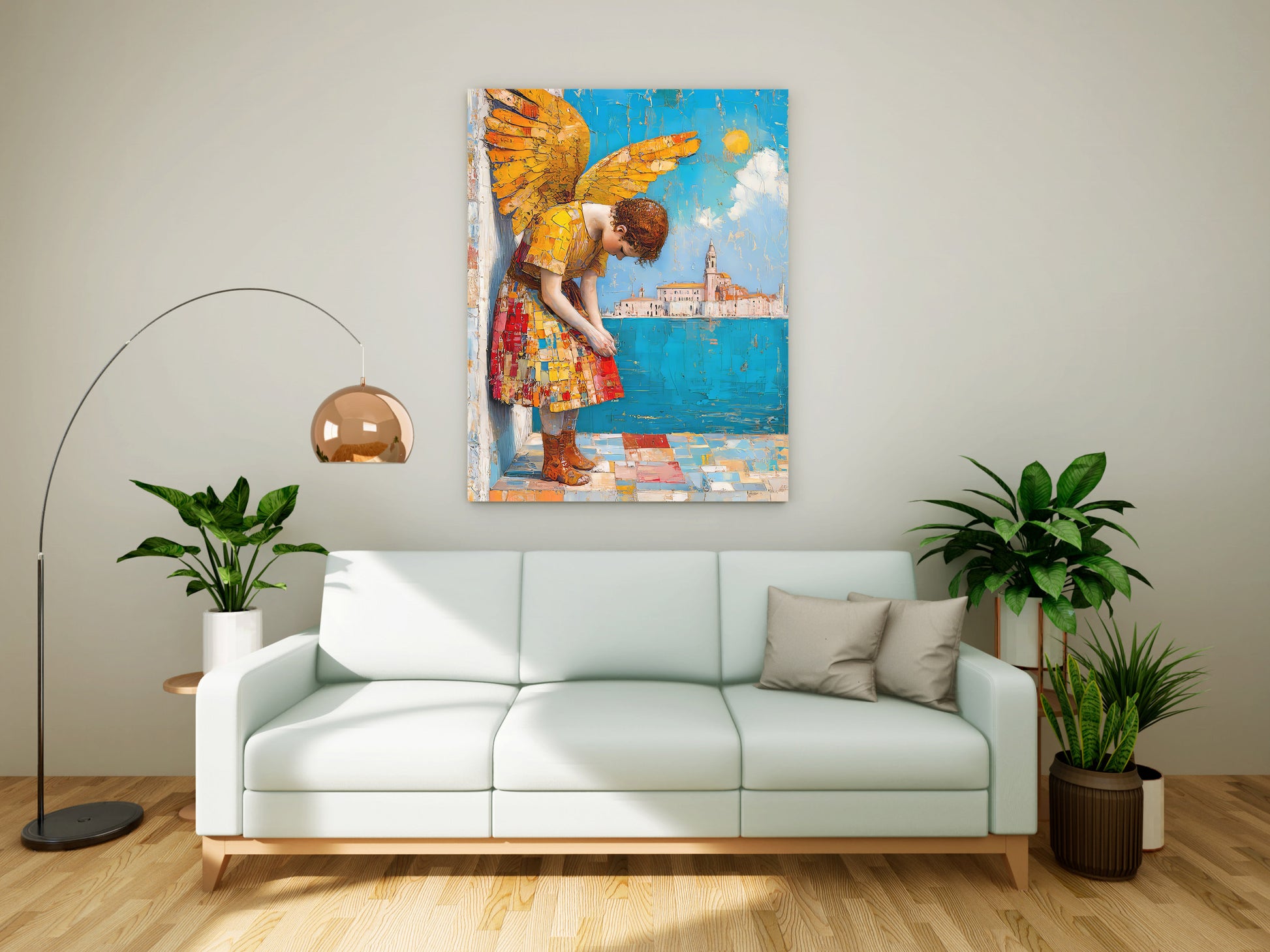 This captivating canvas painting, titled "[Insert chosen title, e.g., The Contemplative Angel]", is a stunning example of contemporary figurative art. It features a young, angelic figure with magnificent, oversized golden wings, leaning pensively against a weathered wall.