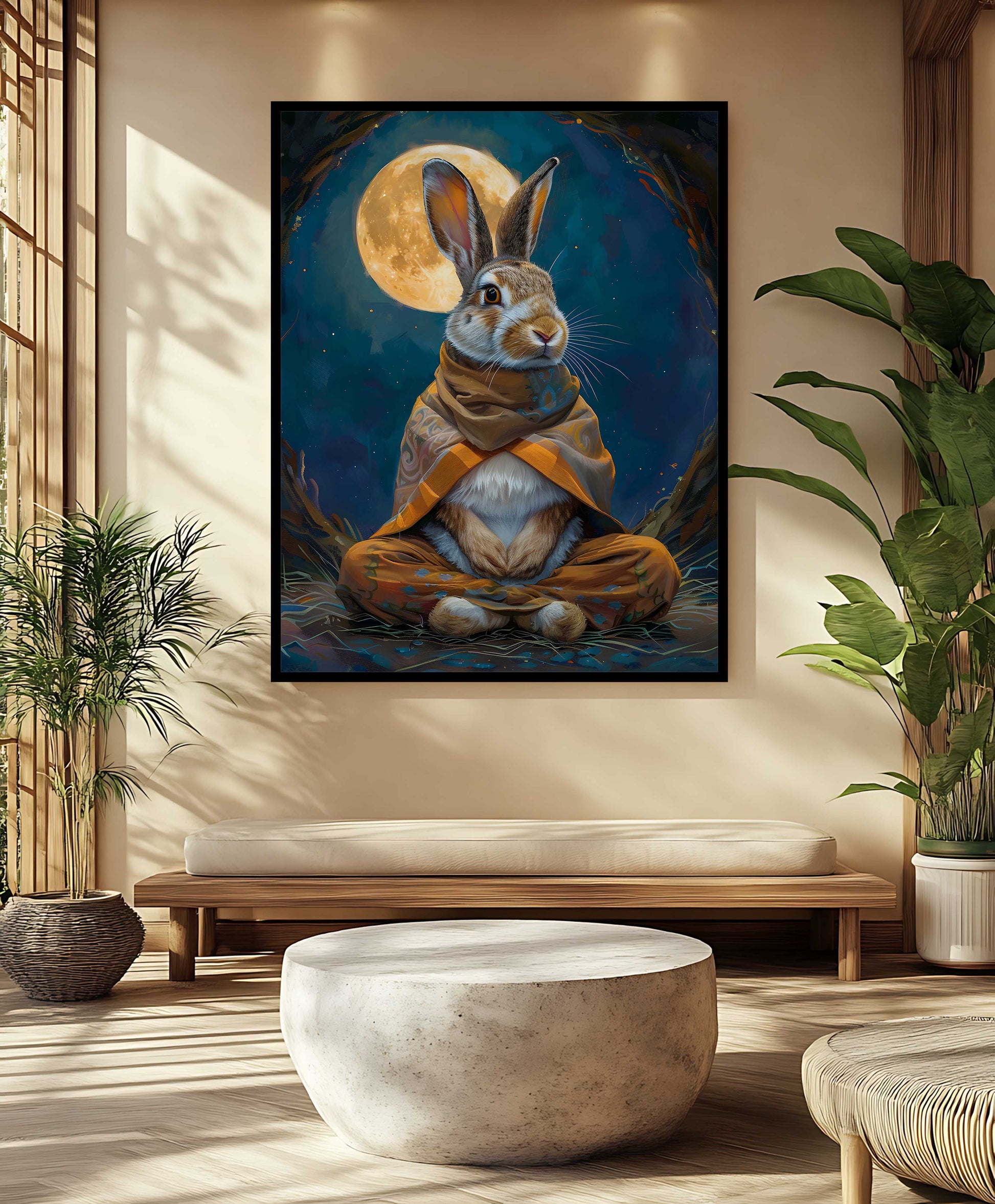 The Moonlit Zen Rabbit: Mystical Meditation Canvas Art