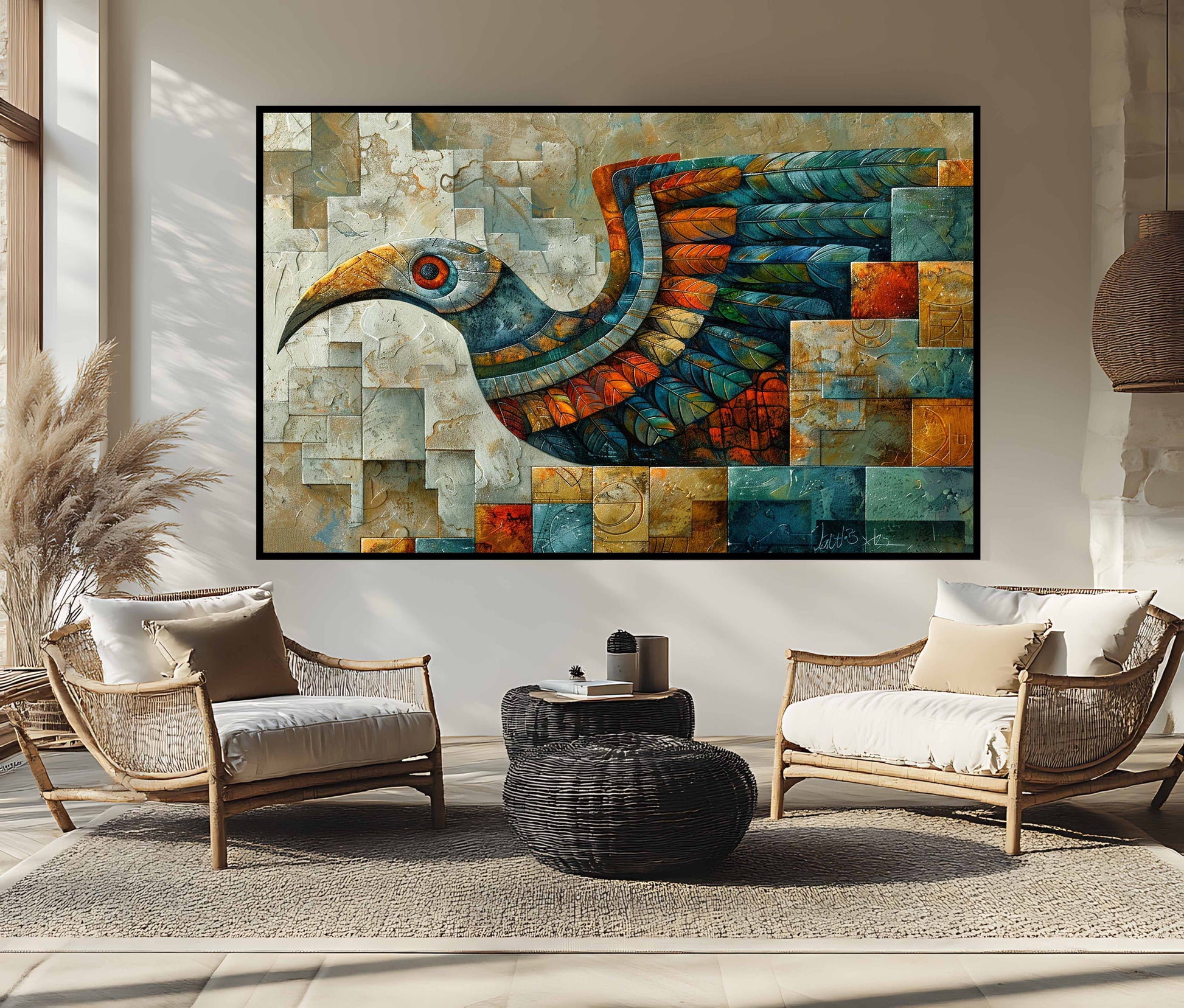 The artist skillfully balances rustic, earthy textures with vibrant, jewel-toned feathers in shades of teal, burnt orange, and emerald. The background, a mosaic-style grid reminiscent of both ancient stone architecture and modern cubism, creates a sense of depth and history. Each "block" in the composition suggests a fragment of a larger story, making this artwork a profound narrative of shared human identity.