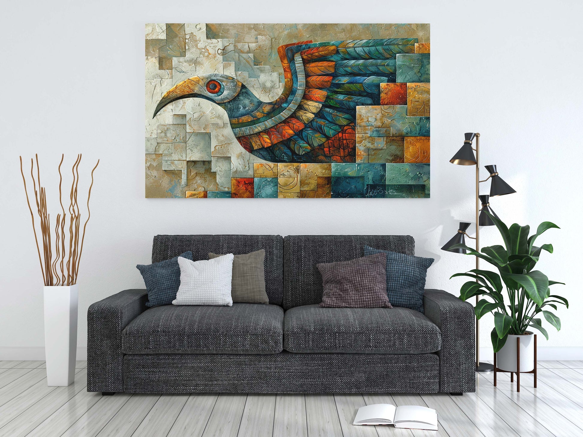 Celebrate the spirit of unity and heritage with The Eternal Messenger, a captivating canvas painting that honors the beauty of global cultural exchange. This striking piece features a masterfully stylized bird—a timeless symbol of freedom and connection—soaring through a complex, geometric landscape.